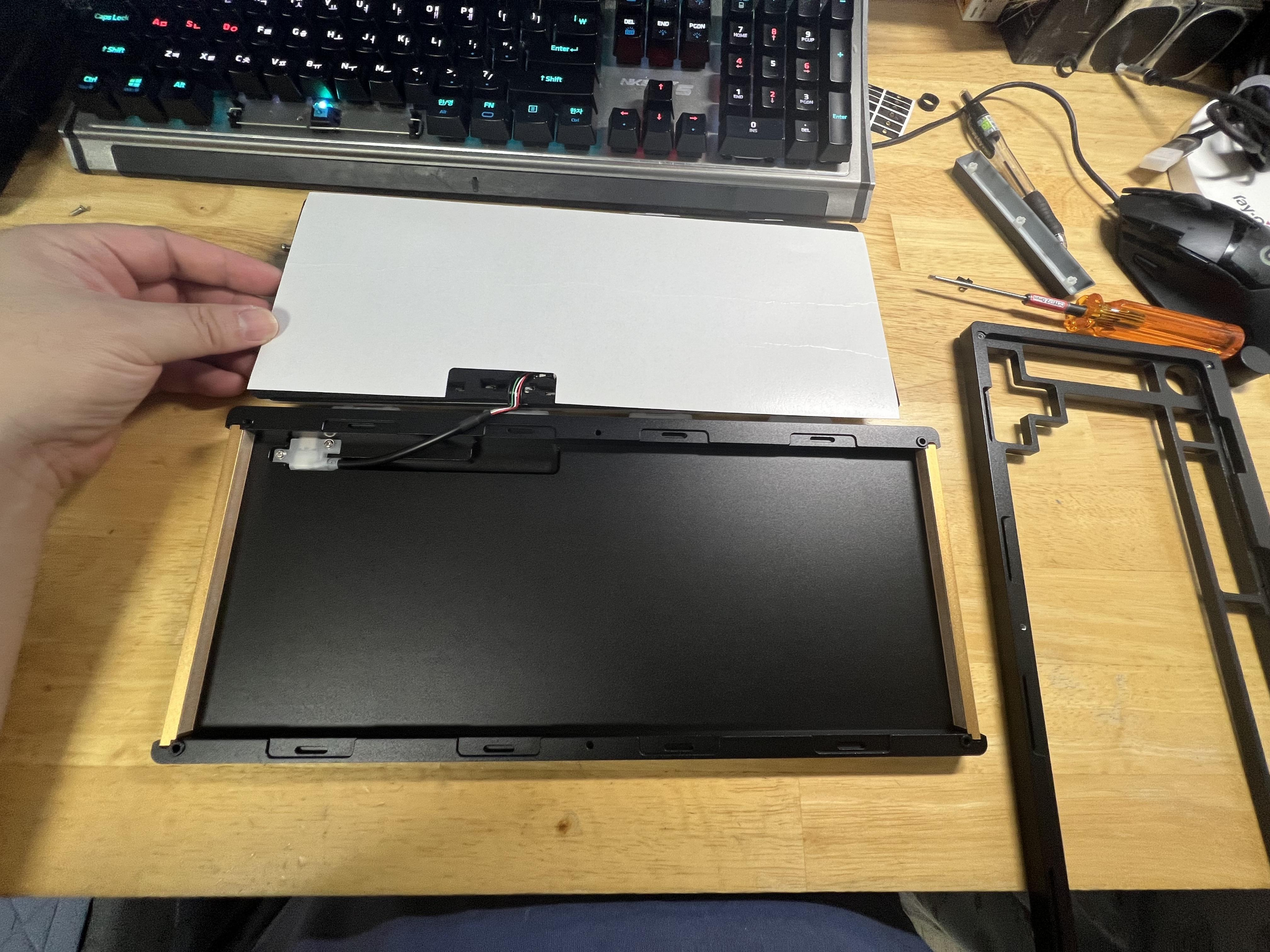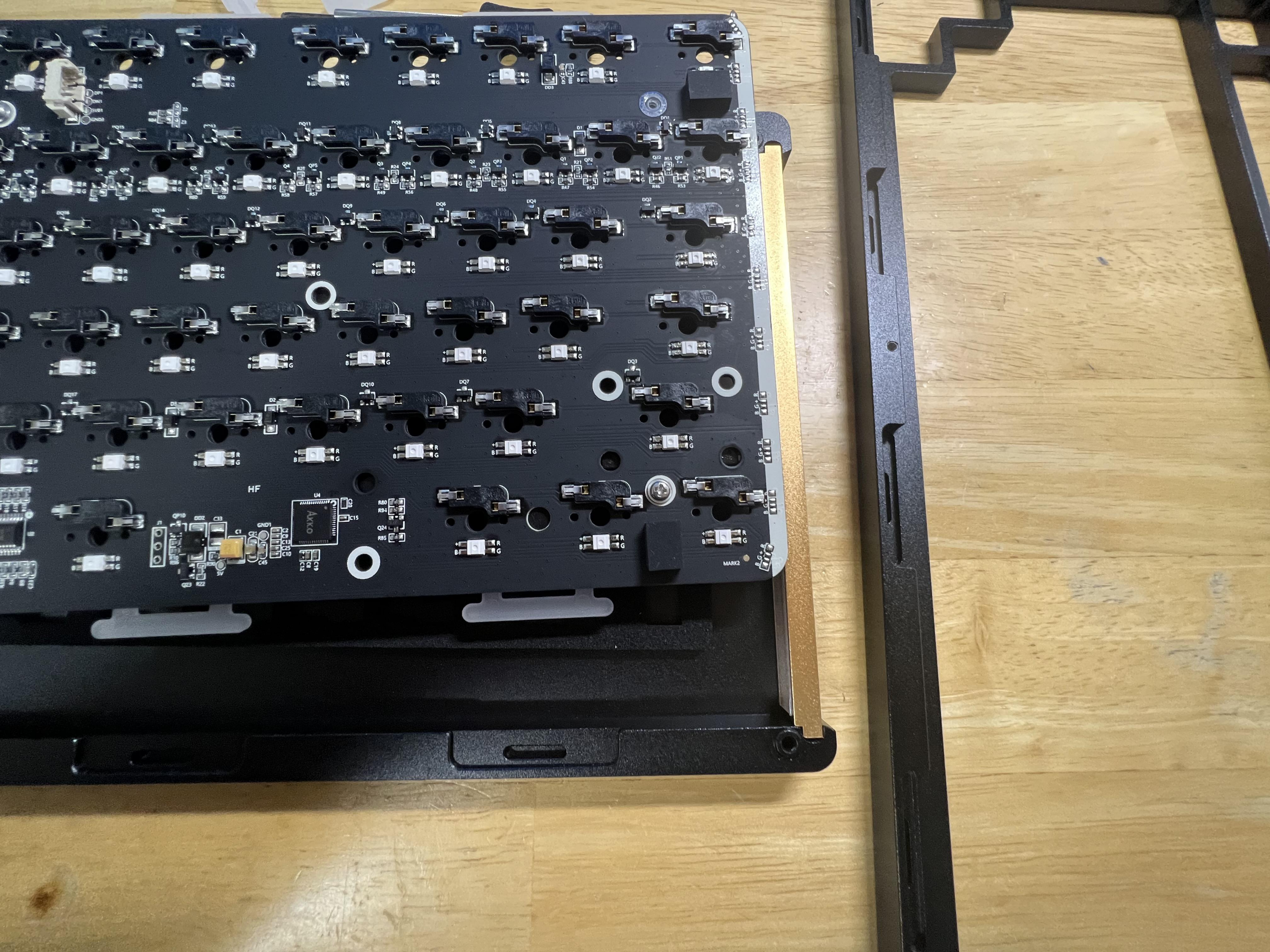 실리콘으로된 보형물이 있어 프레임에 물리는 형태이다 상부 pc 보강판과 pcb기판 사이에 흡음제가 있고 pcb기판